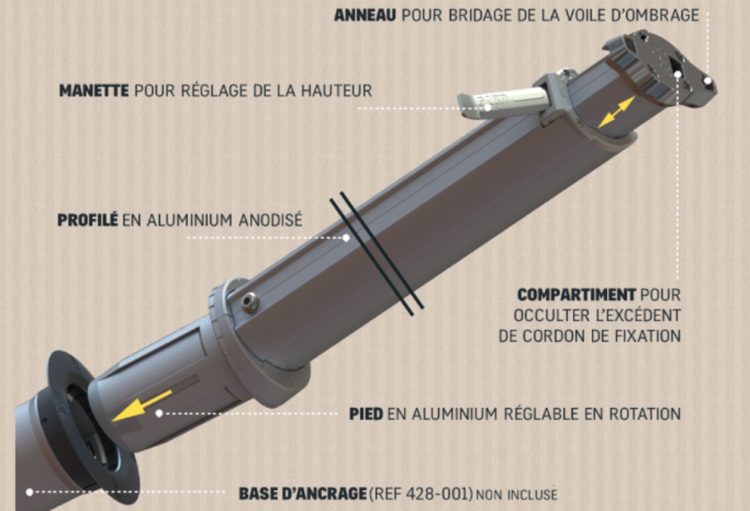 De conception française, fabriqué en aluminium anodisé et en alliage chromé, le mât pour la fixation de voiles d'ombrage est conçu pour durer. De plus, son inclinaison de 10 degrés permet de mieux tendre votre toile et offre une touche visuelle incomparable. Surtout, vous obtiendrez des points d'attaches robustes afin de fixer votre équipement d'ombrage partout dans votre jardin !